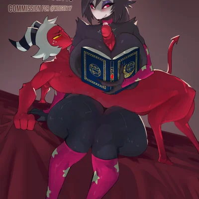 moxxie (helluva boss), octavia (helluva boss) (book covering breasts, hellaverse) created by chinvin18