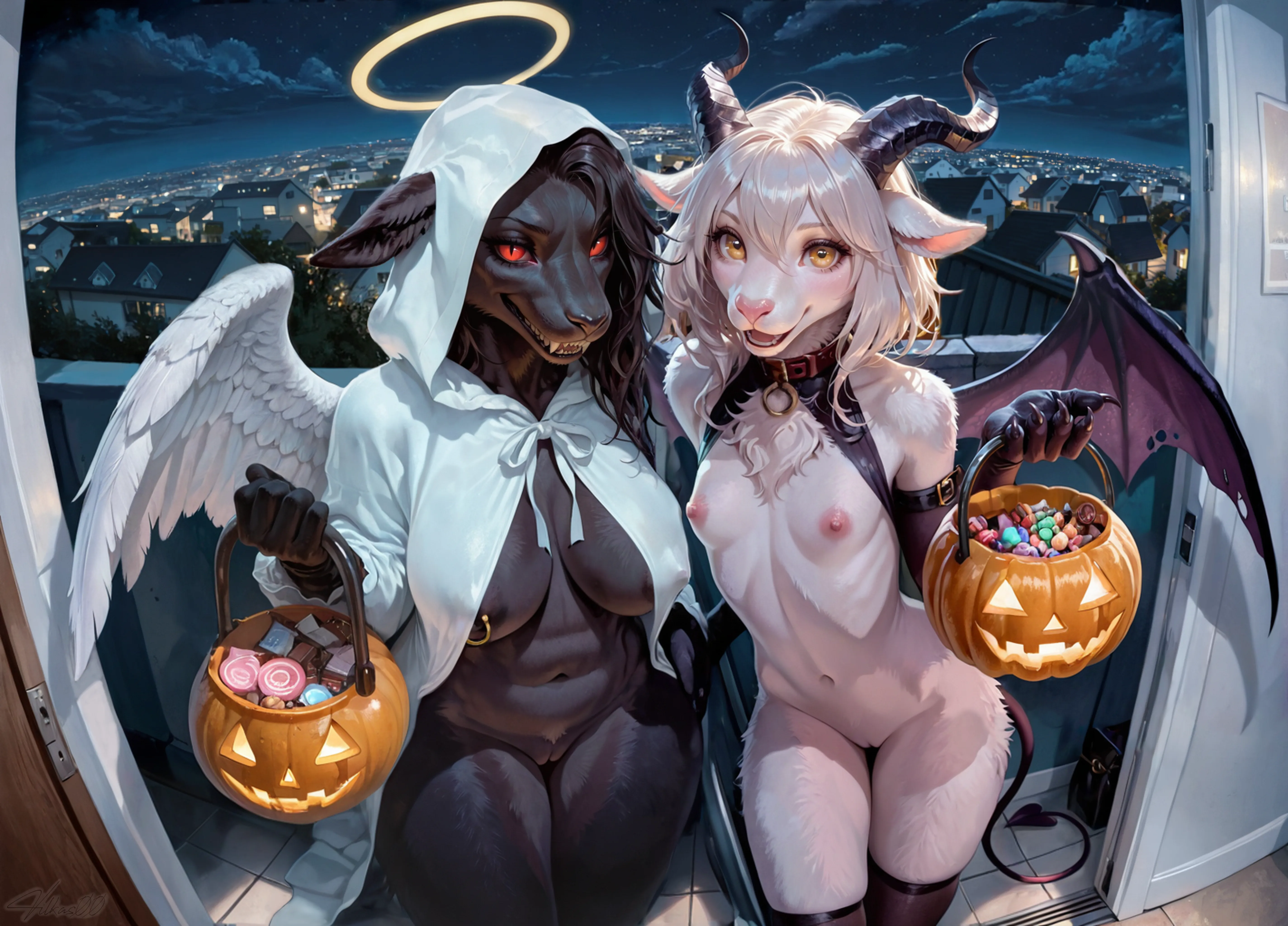 Angel And Goat Demon Duo Trick-Or-Treating In Costumes | Yiff Party