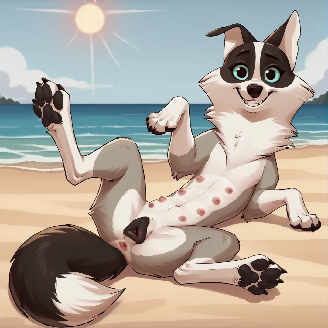 BorderCollie On Beach Spreading Legs Showing Pussy And Nipples Smiling | Yiff Party