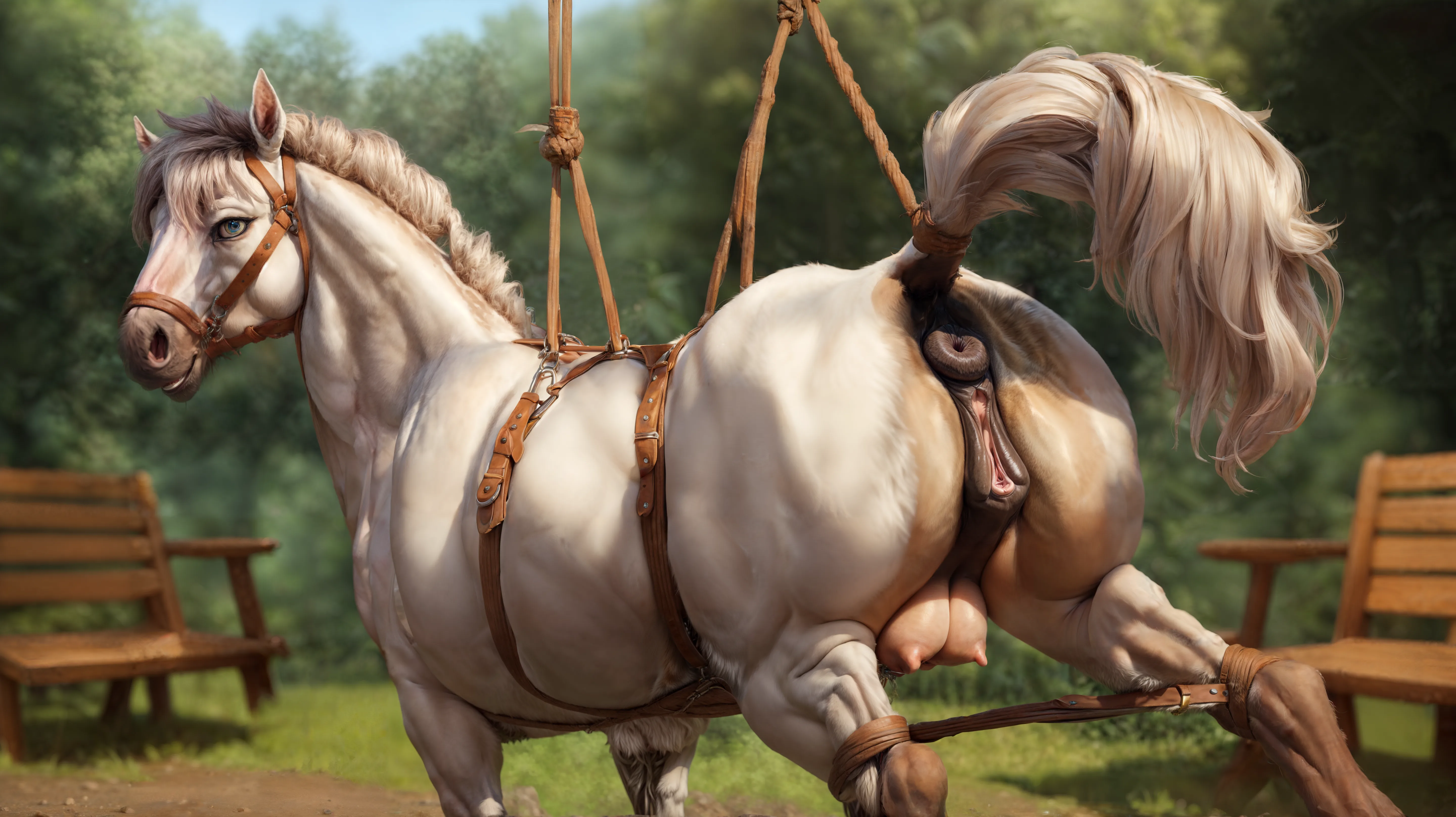 Bound White Mare'S Rear View In Park Nature Setting | Yiff Party