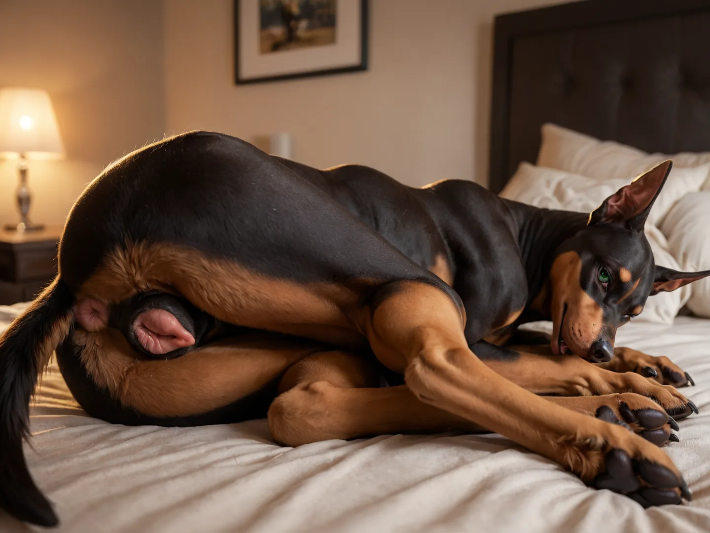 Dobermann Pinscher Bitch Presenting Pussy And Anus On Bed | Yiff Party