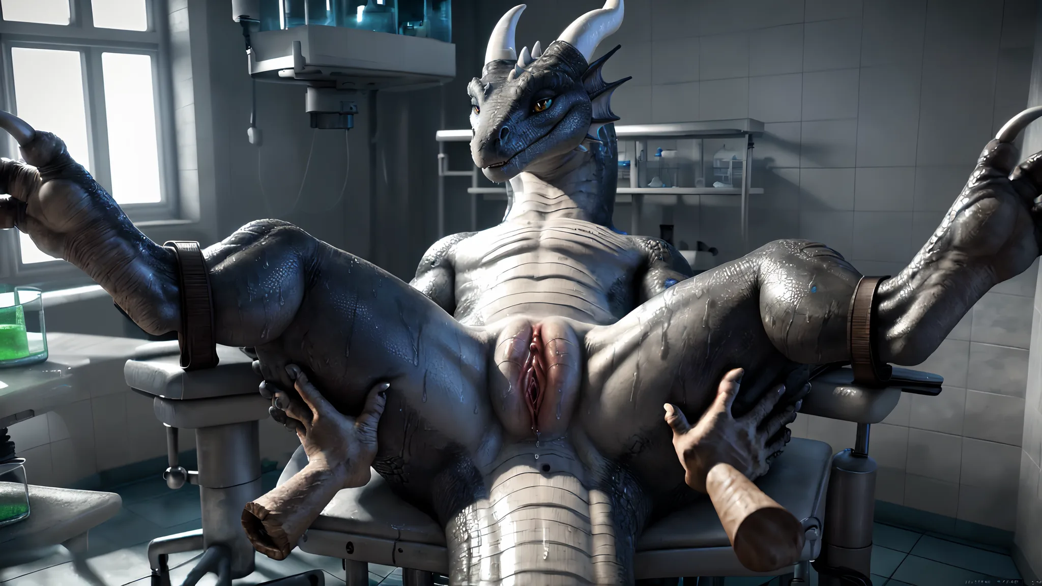 Dragoness Bound In Lab With Straps Spread Legs And Pussy Exposed | Yiff Party