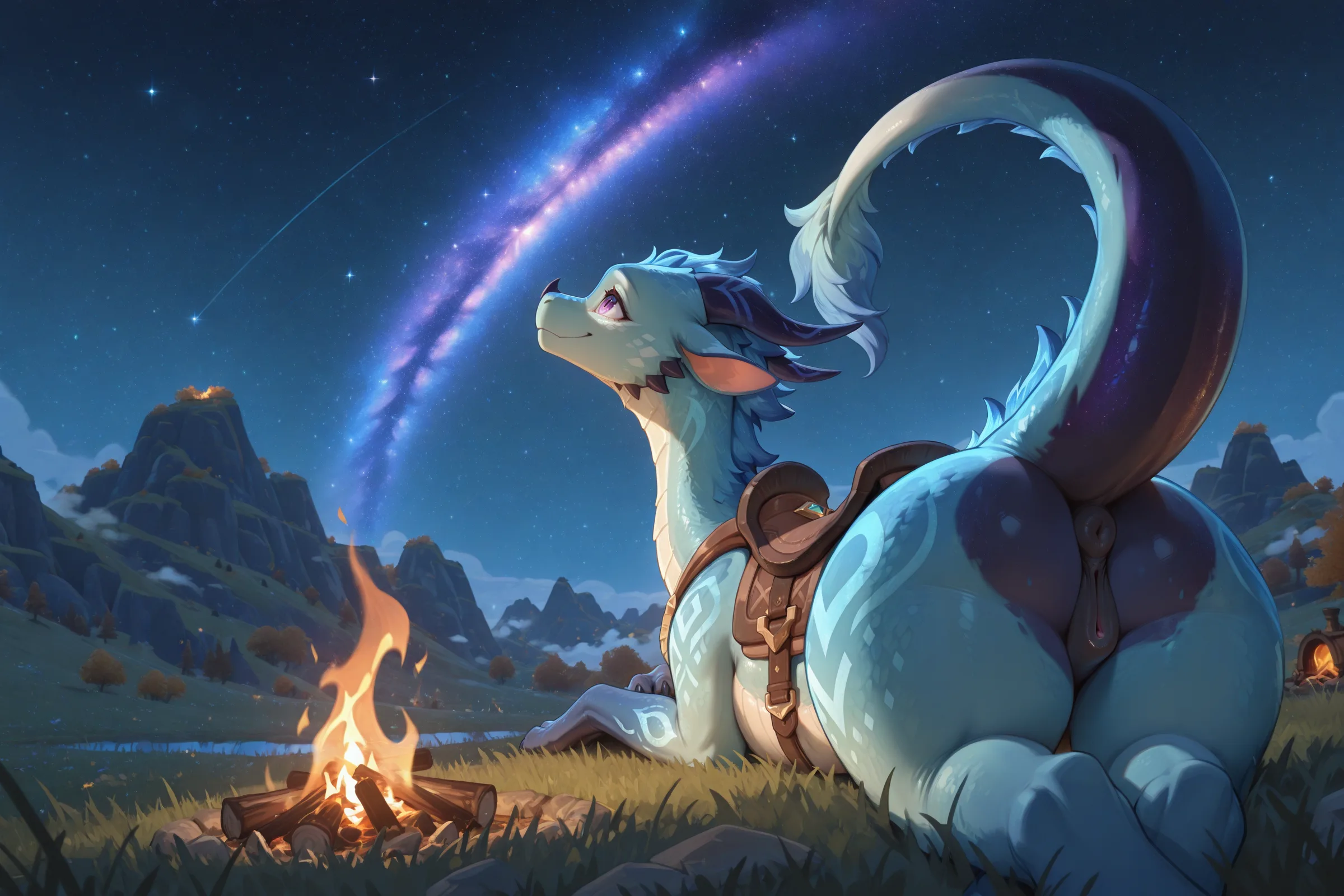 Feral Dragoness With Purple Eyes Spreads Pussy By Campfire Under Galax | Yiff Party