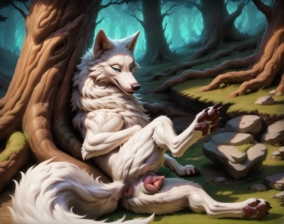Feral White Wolf Vixen Presents Gleaming Pink Pussy In Forest | Yiff Party