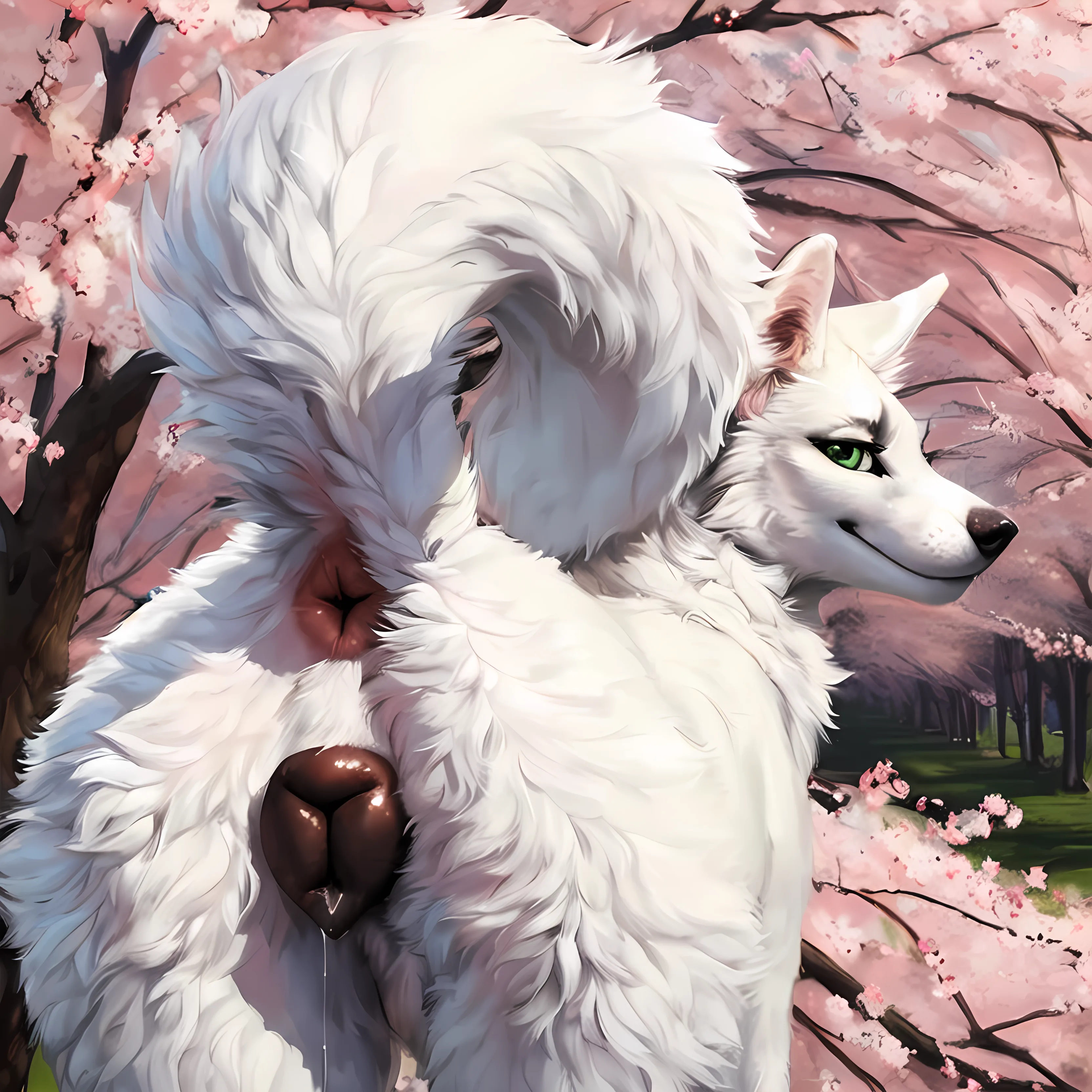 Fluffy White Wolf Vixen Presenting Wet Pussy Under Cherry Blossom Tree | Yiff Party
