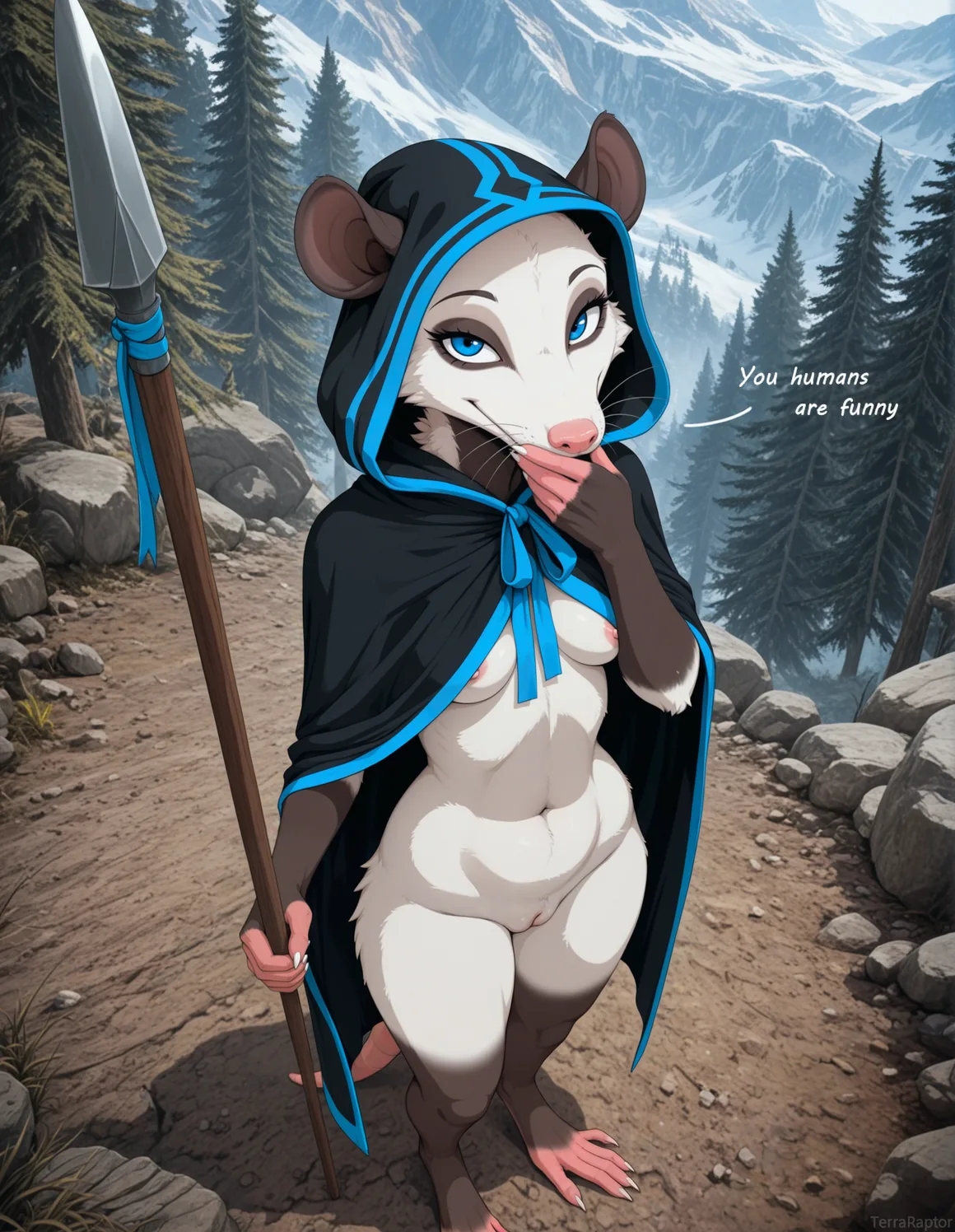 Laughing White Opossum Female Barefoot With Spear And Cloak In Forest | Yiff Party