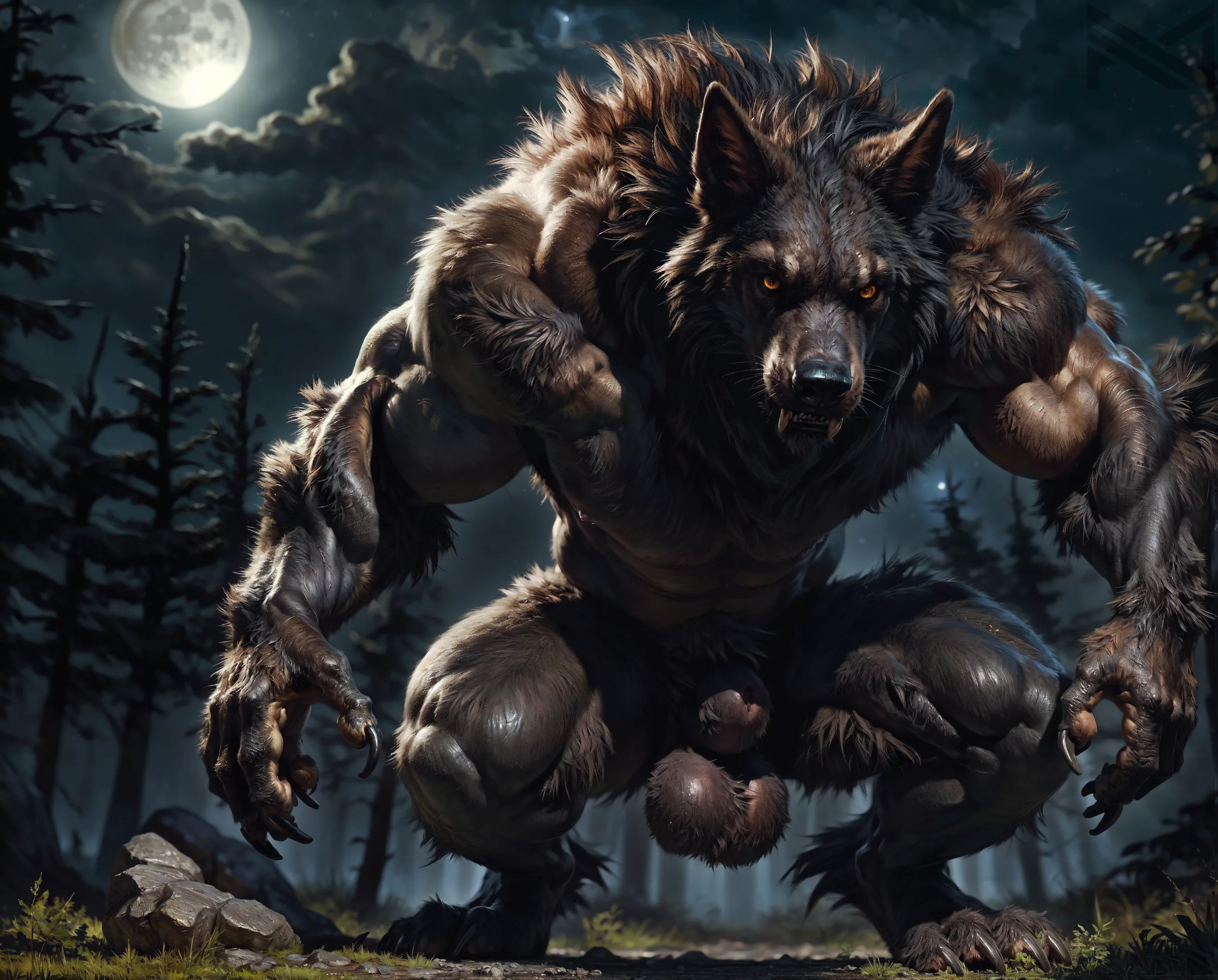 Muscular Anthro Wolf Crouching Nude In Forest At Night With Detailed F | Yiff Party