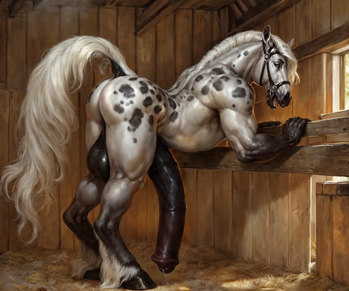 Muscular Black Furred White Spotted Horse Anthro Leaning Back Bent Ove | Yiff Party