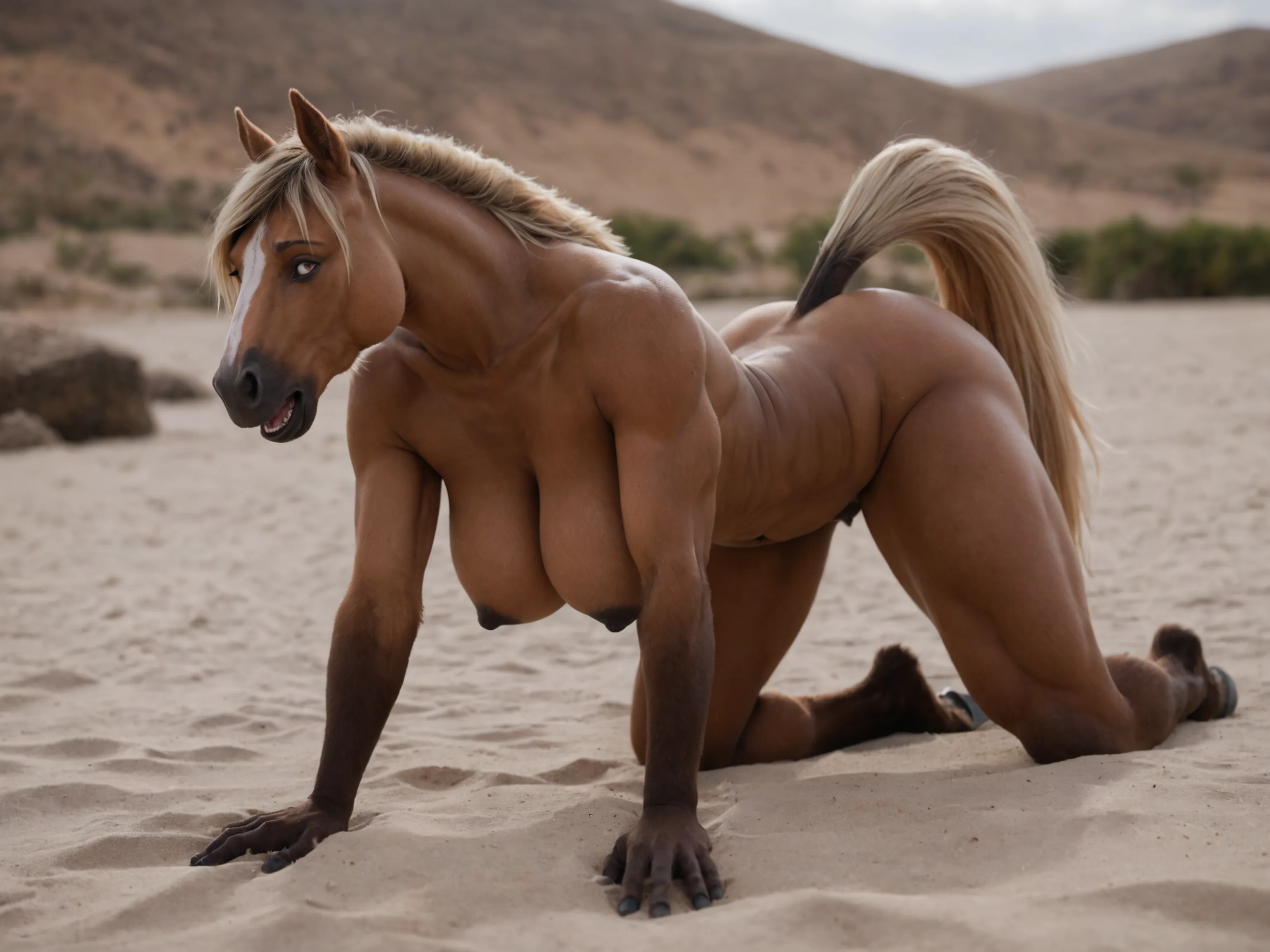 Muscular Blonde Equine Mare Nude On Beach With Big Breasts And Hooves | Yiff Party