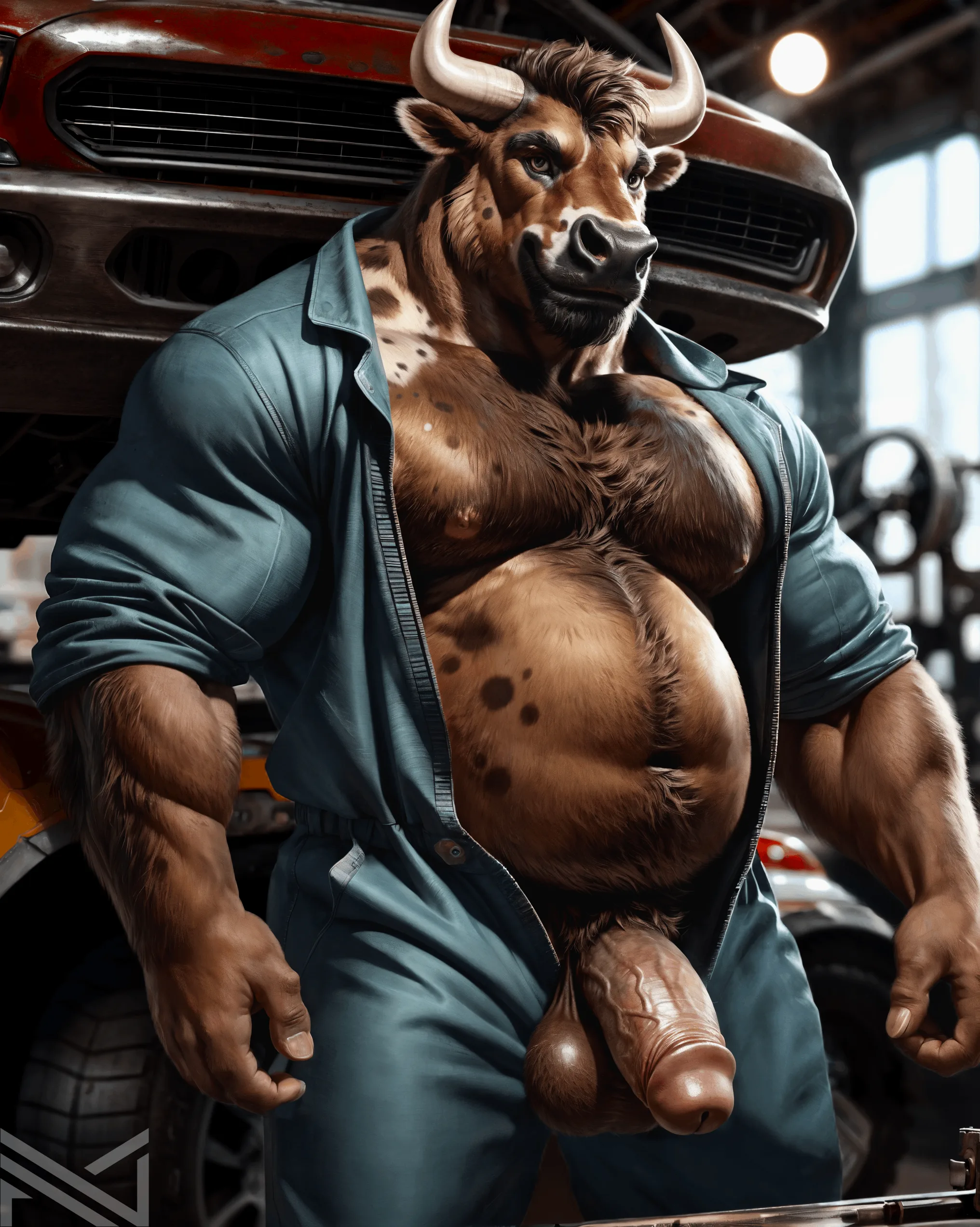 Muscular Bovine Mechanic Flaunts Flaccid Veiny Cattle Cock And Bulging | Yiff Party