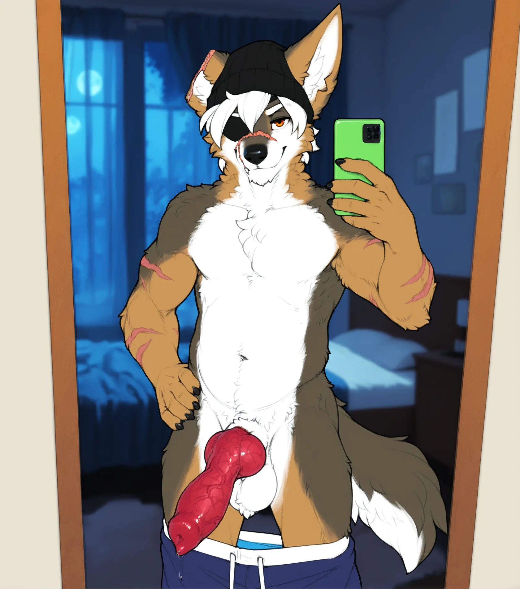 Muscular Coyote In Beanie And Eye Patch Shows Off His Knotting Canine | Yiff Party