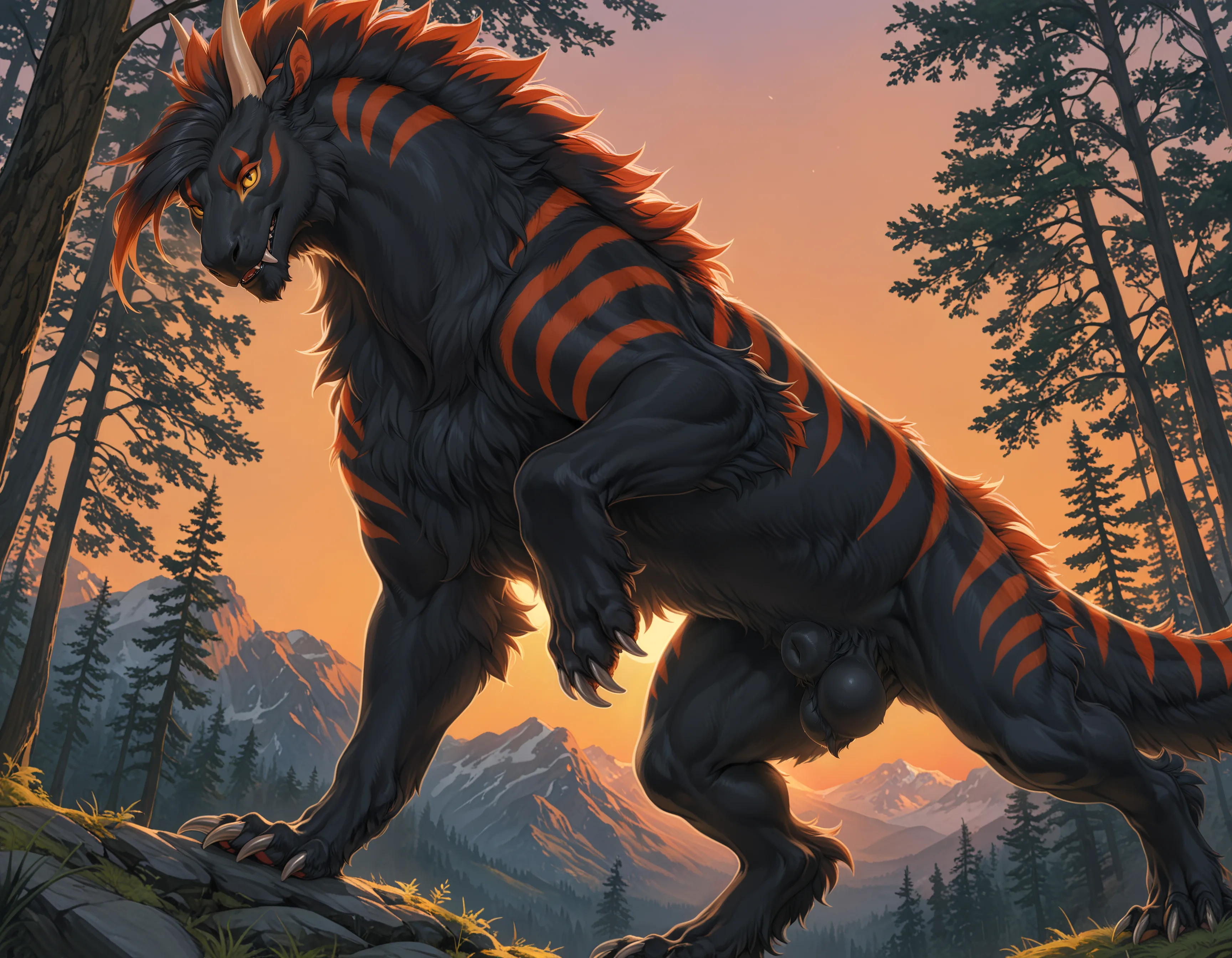 Muscular Felkin With Big Black Balls And Striped Fur On Sunset Mountai | Yiff Party