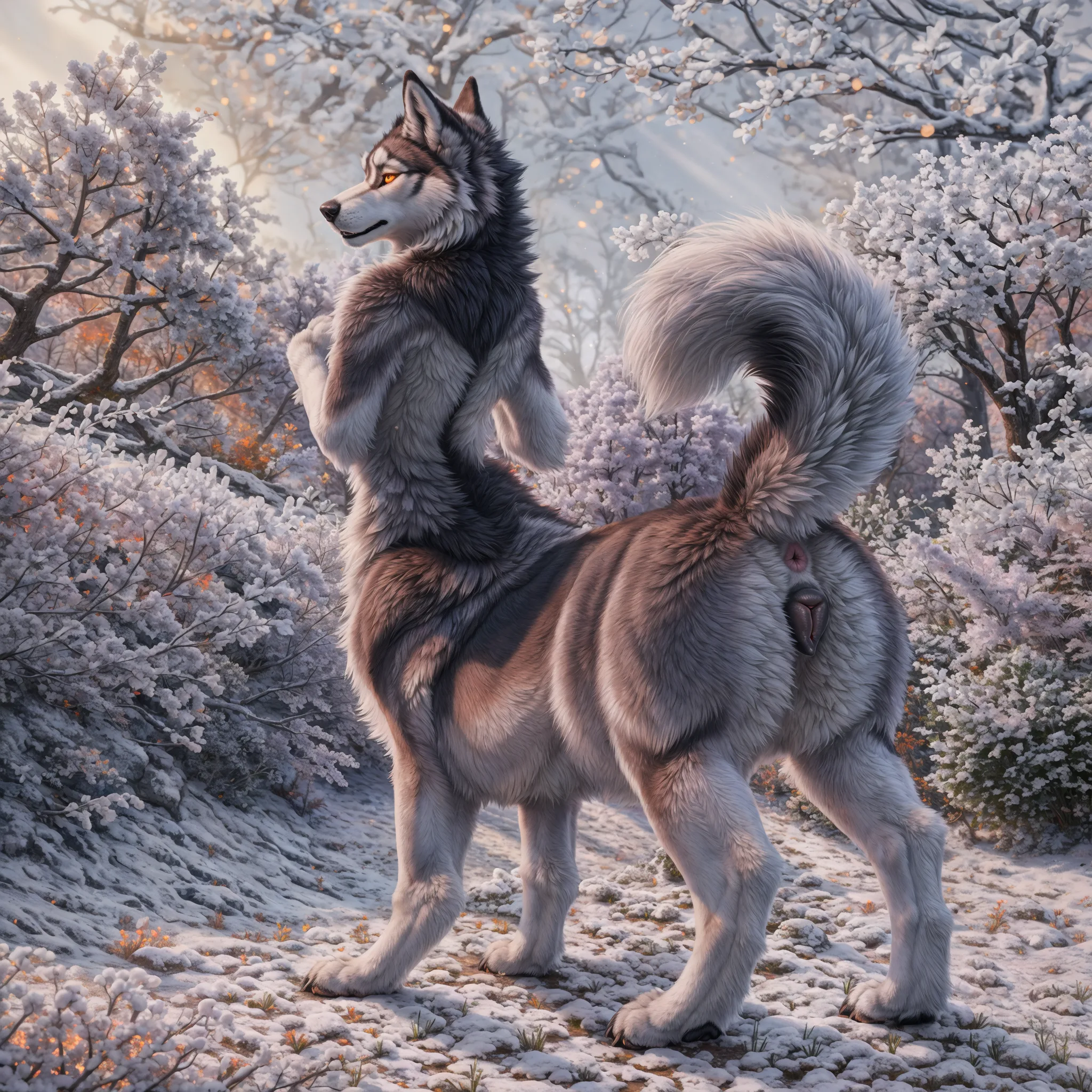 Smug Sled Dog Taur Presenting Fluffy Pink Pussy In Snowy Daylight | Yiff Party