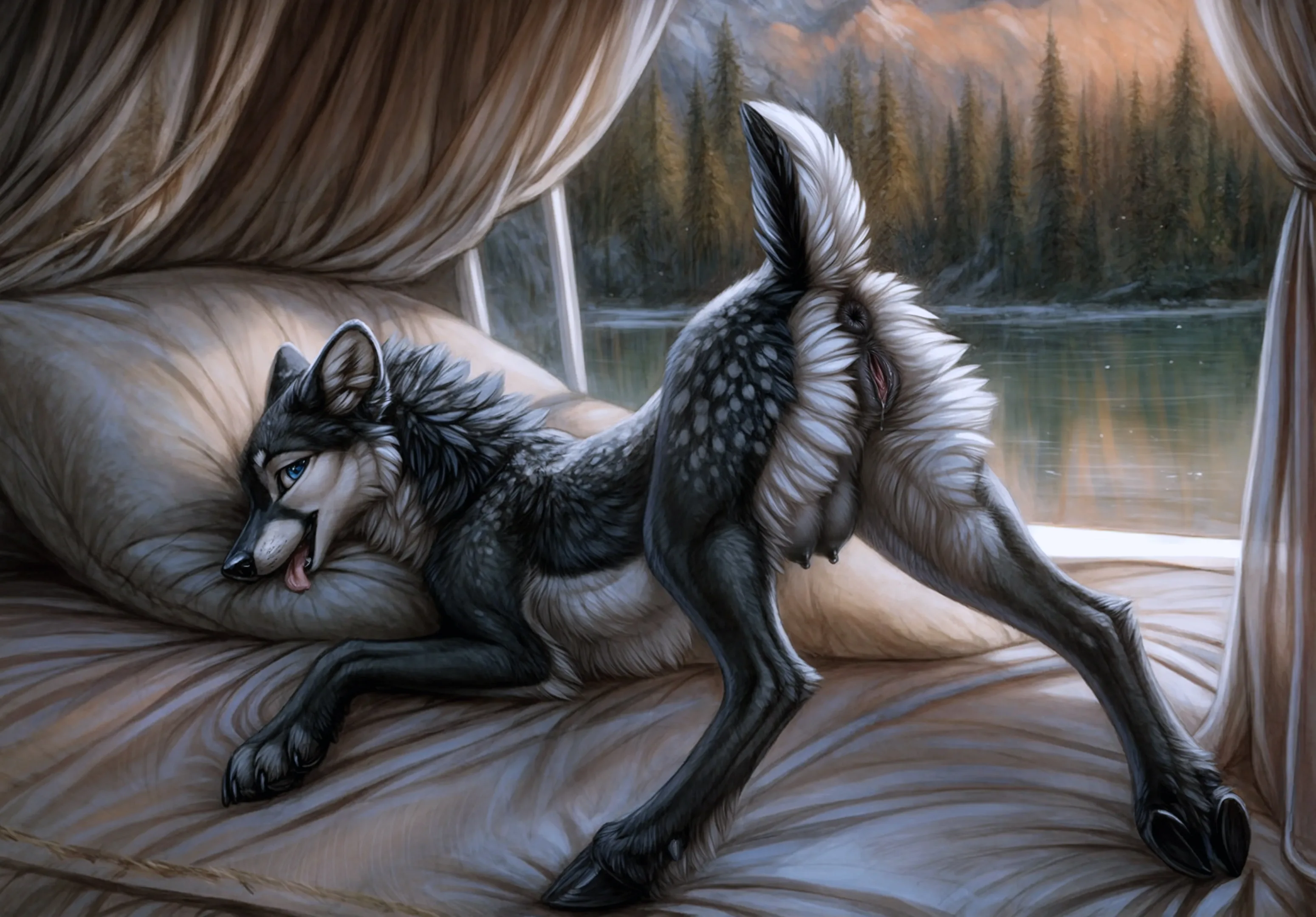 Spotted Wolf-Deer Hybrid Presenting Dripping Wet Pussy On Bed By Woodl | Yiff Party