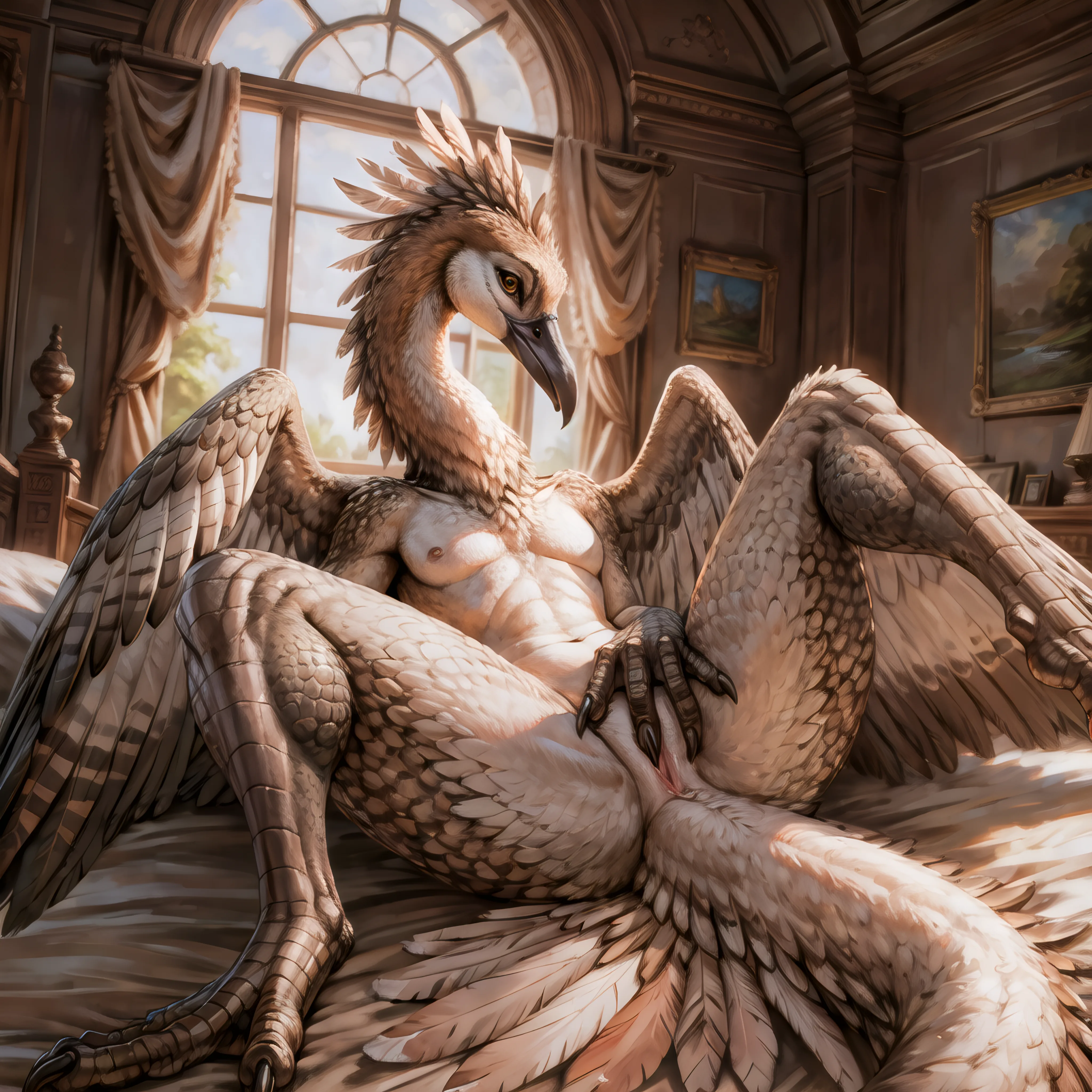 Sultry Avian Vixen Spreads Legs Wide On Bed, Wings And Crest Prominent | Yiff Party