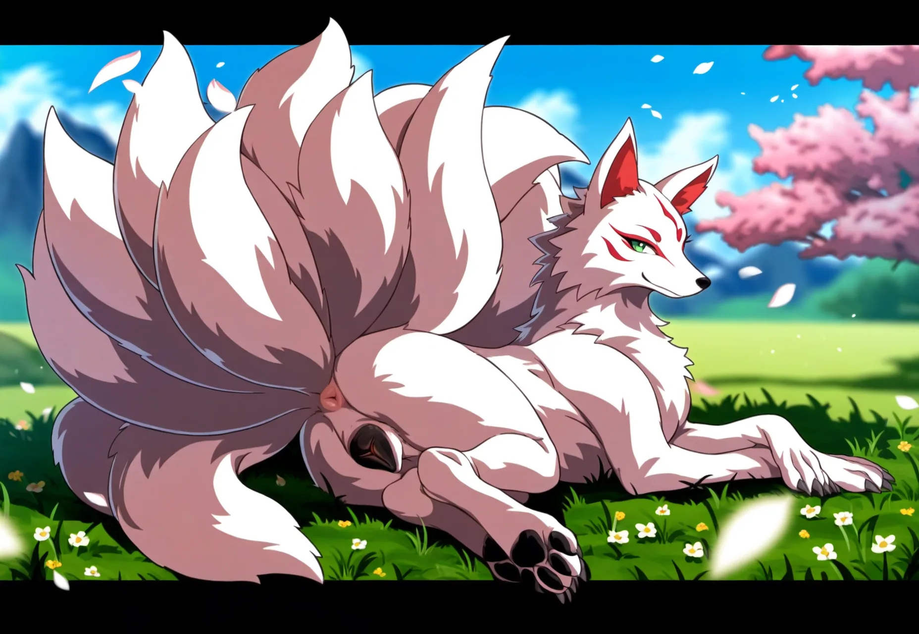 Sultry White Fox Seductively Lying On Grass With Cherry Trees | Yiff Party