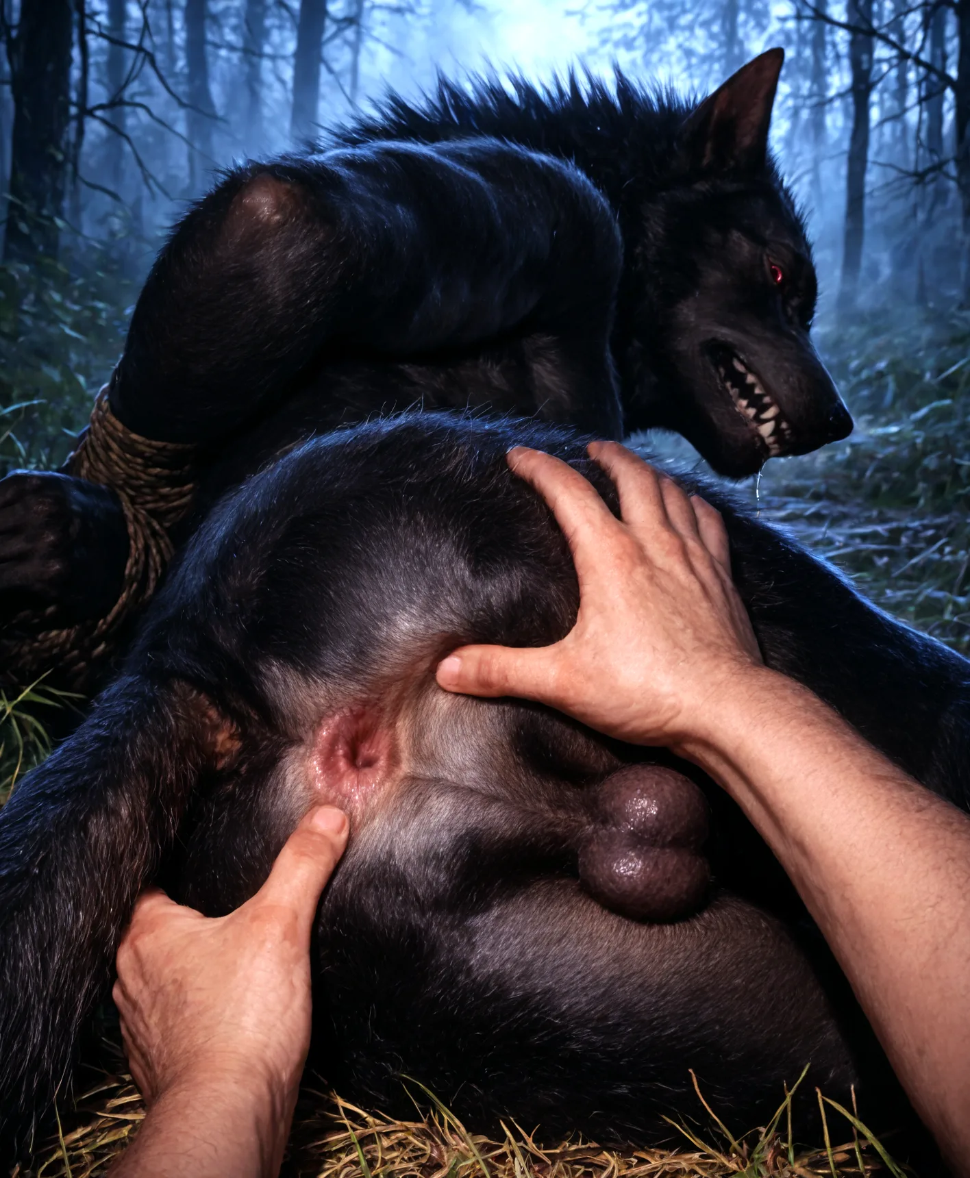 Werewolf And Human On Ground In Forest, Muscular Male Bodies Tied And | Yiff Party