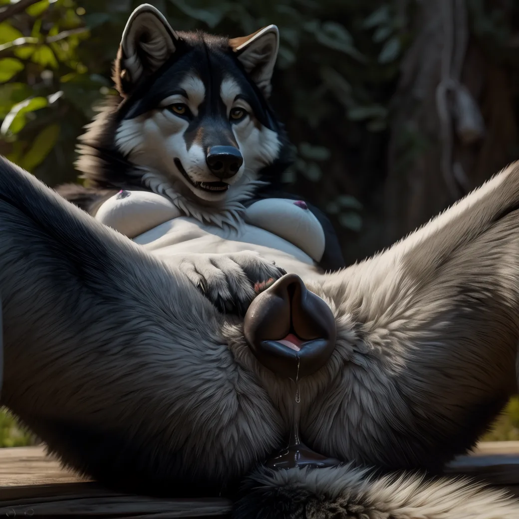 Wet Grey Canid Presents Puffy Canine Pussy And Breasts For Viewer | Yiff Party