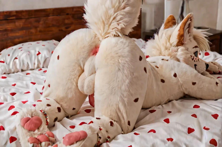 White Canine Fursuiter Presents Raised Tail And Perineum On Bed | Yiff Party