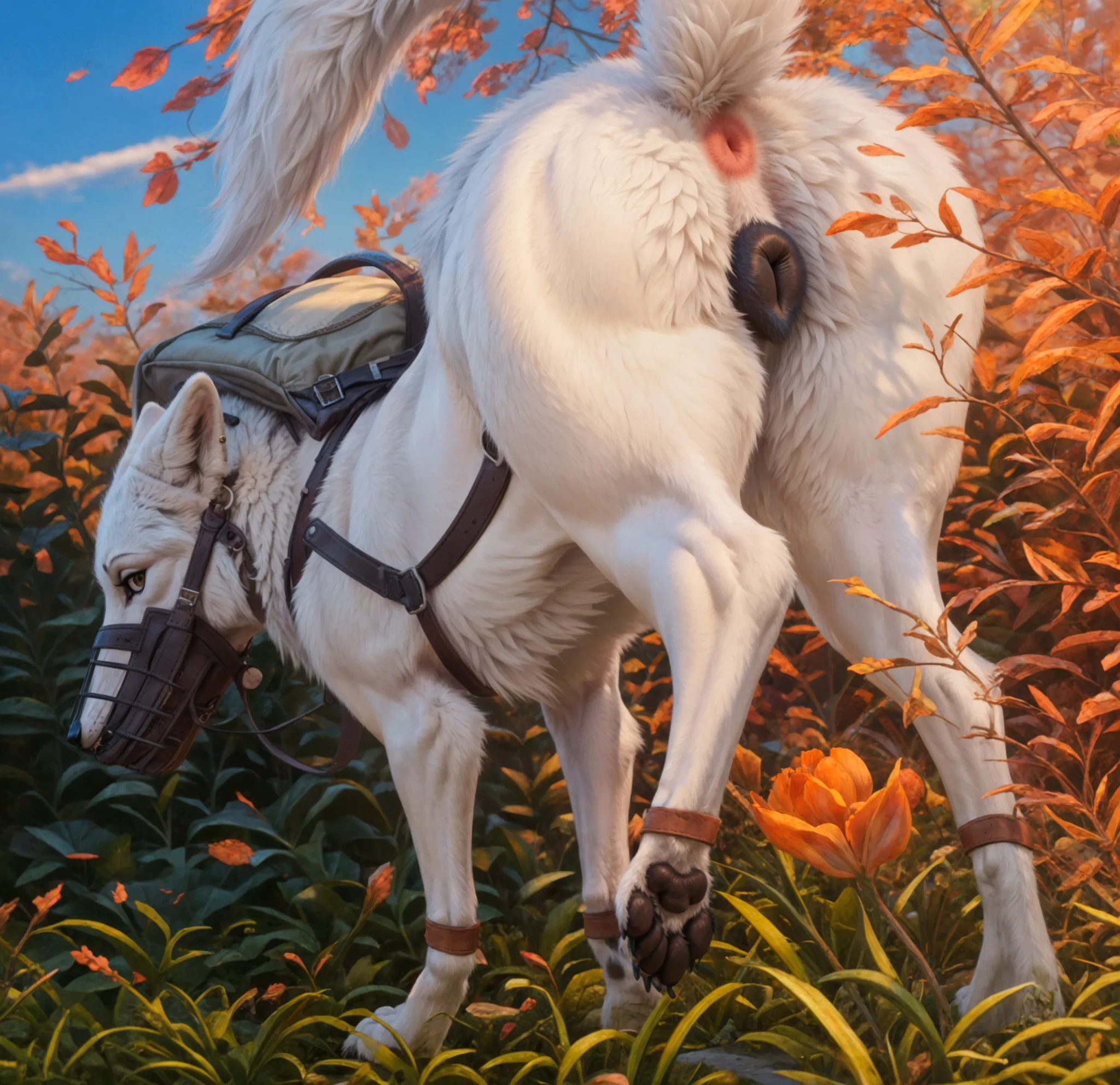 White Wolf With Harness And Piercings, Masturbating In Nature | Yiff Party