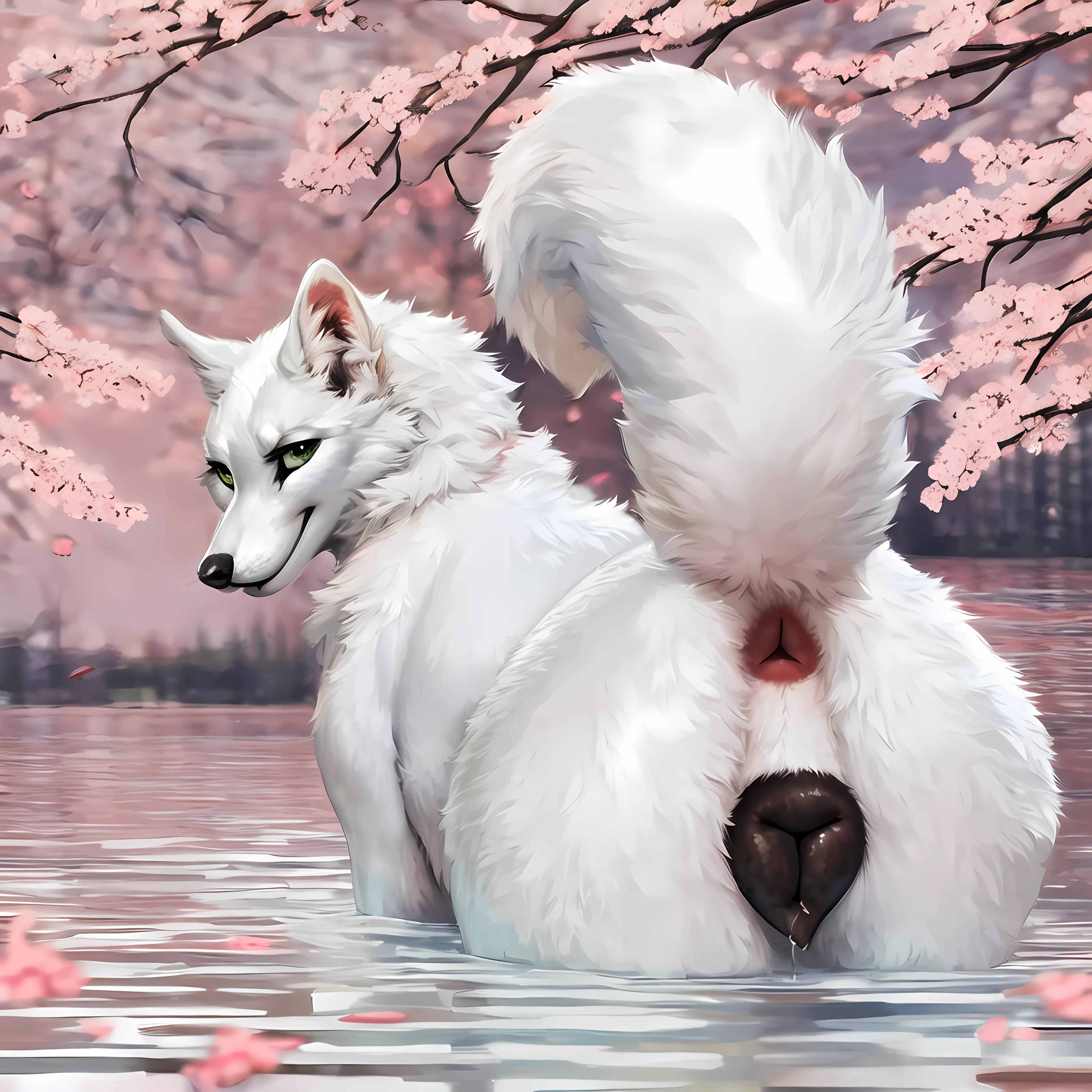 White Wolfess Exposed In Cherry Blossom Pond | Yiff Party