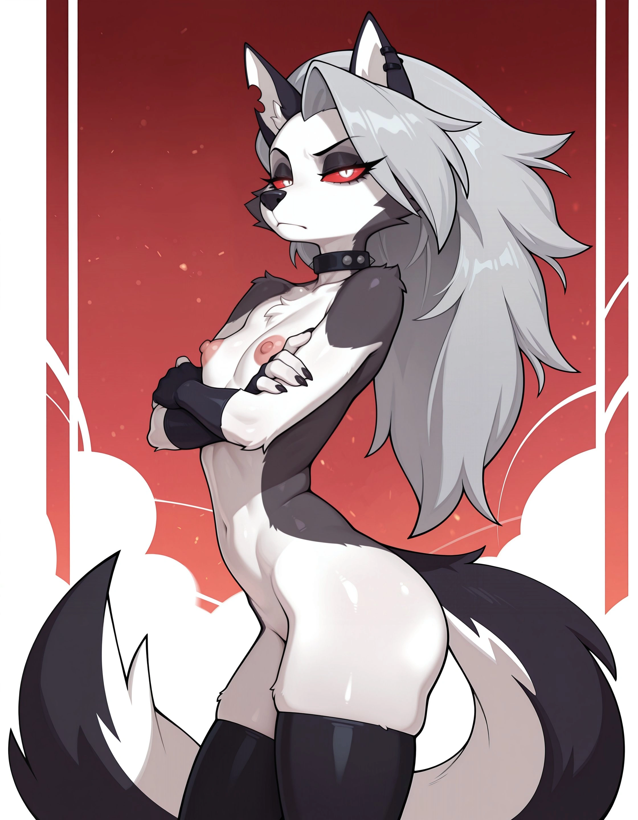 WhiteFurredBlackCanidDemonHellhoundLoonaSulkingSpikedCollarStockingsSo | Yiff Party