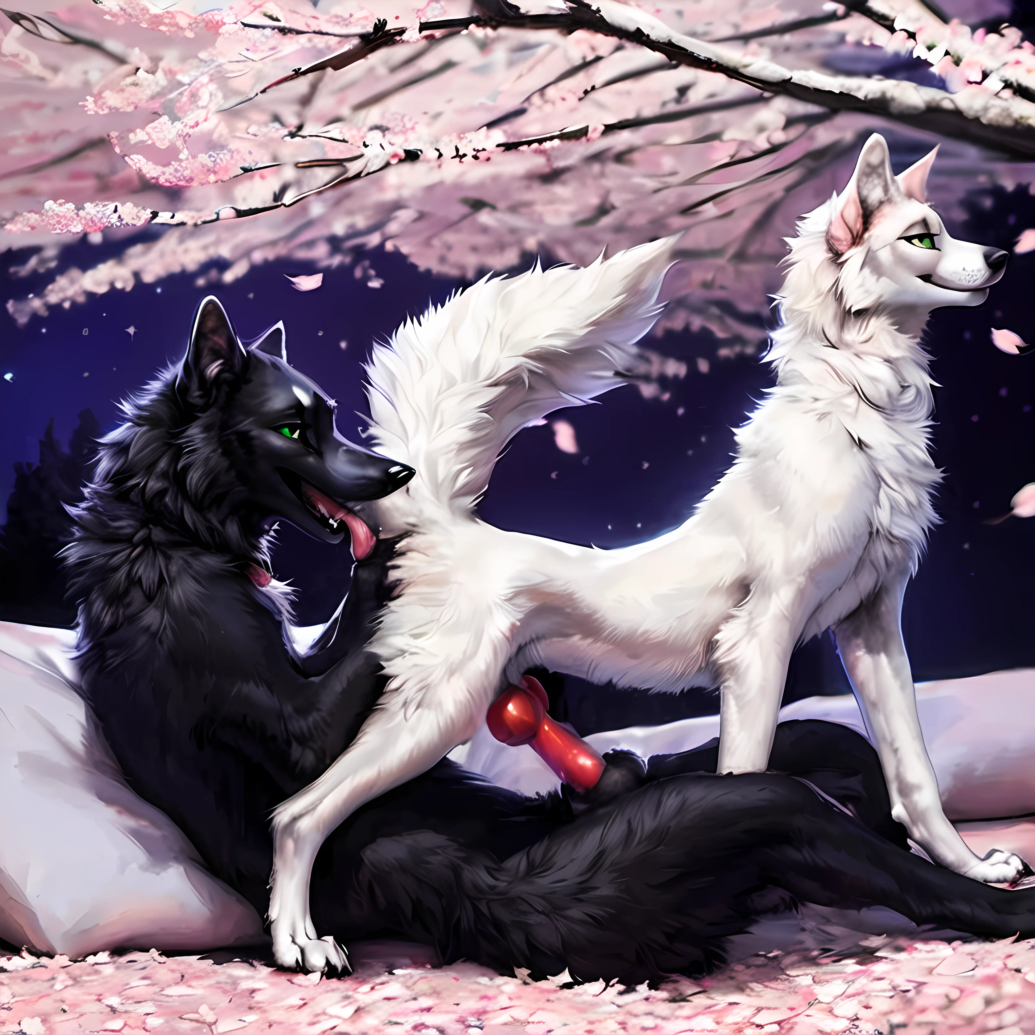 Wolf And Canid Duo Intertwined Under Cherry Blossom Night | Yiff Party