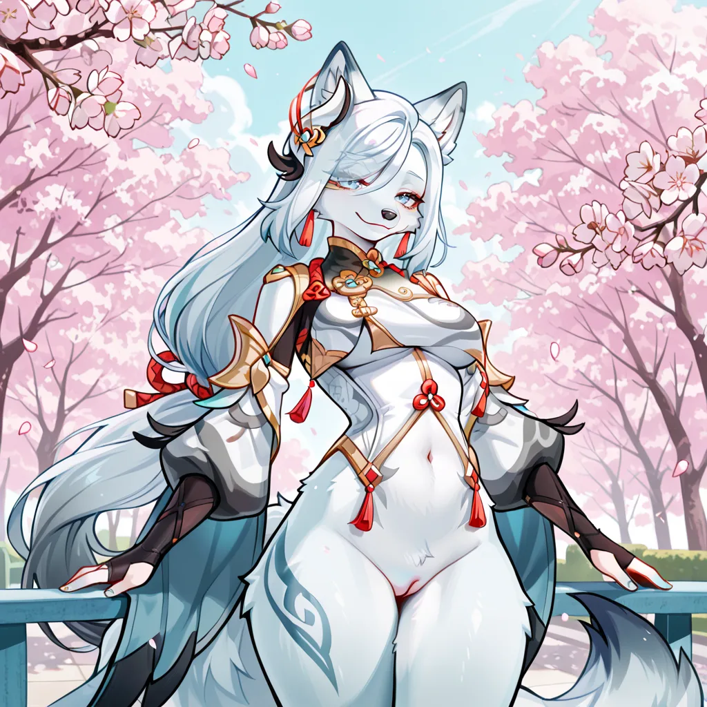 Wolf Anthro Female Standing Bottomless Under Cherry Tree Pussy Visible | Yiff Party