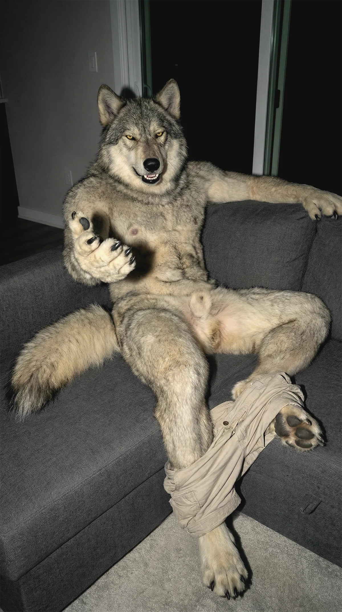 Wolf Anthro Muscular Male Grey Tan Fur Shorts Down Spreading Genitals | Yiff Party