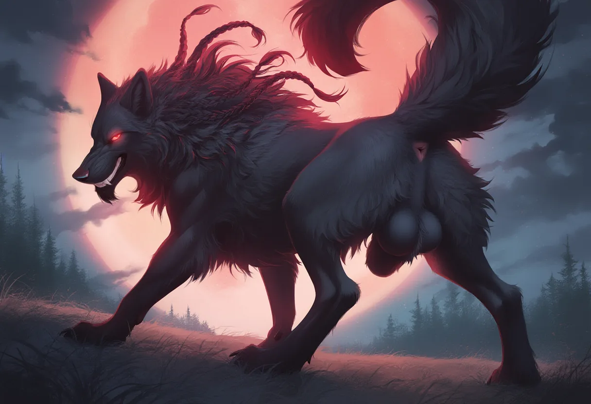 Wolf On All Fours Showing Animal Genitalia In Forest Under Red Moon | Yiff Party