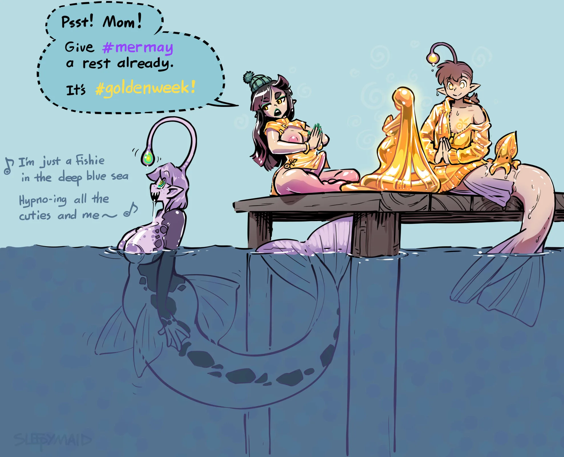 Acrylic (Sleepymaid), Lena (Sleepymaid), Mui (Sleepymaid) (Golden Week, Mermay) Created By Sleepymaid | Yiff Party