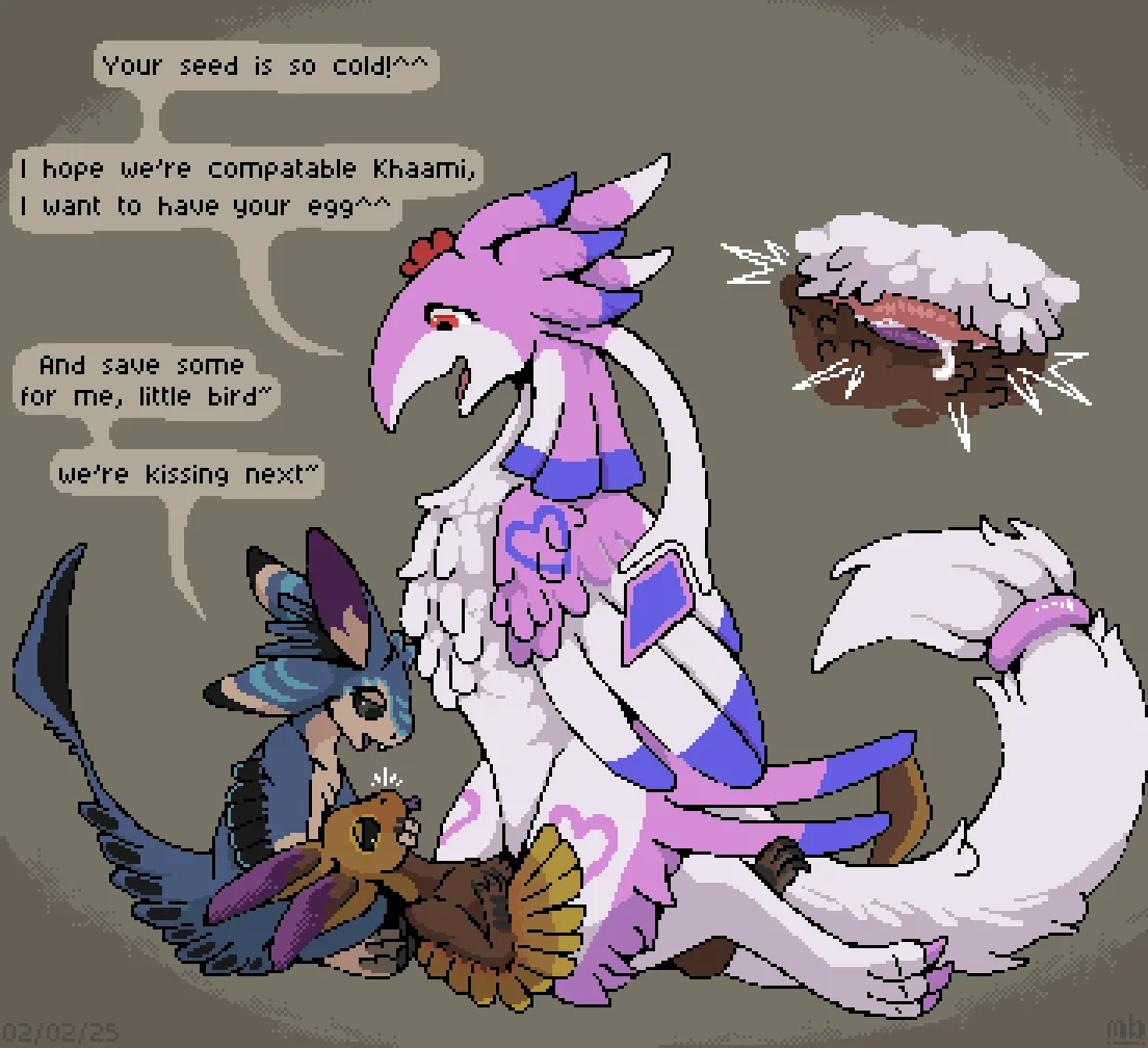 dragoina the lovebird, khaami (mustard), taluki (vixie) created by mustard (welcometothevoid)