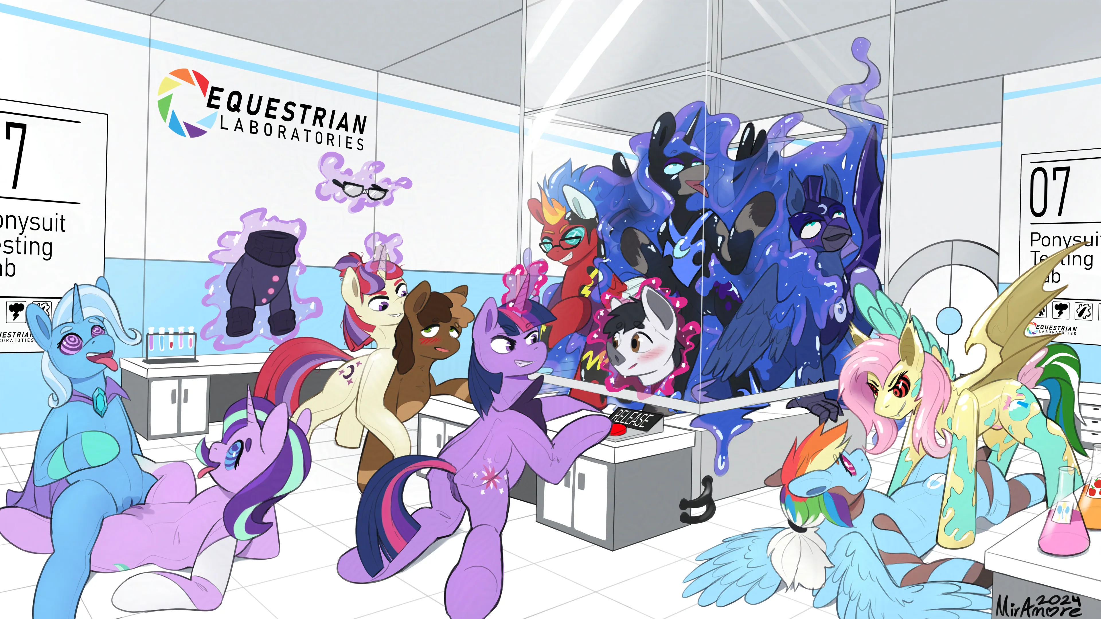 flutterbat (mlp), fluttershy (mlp), moonatik (oc) (aperture science, friendship is magic) created by miramore